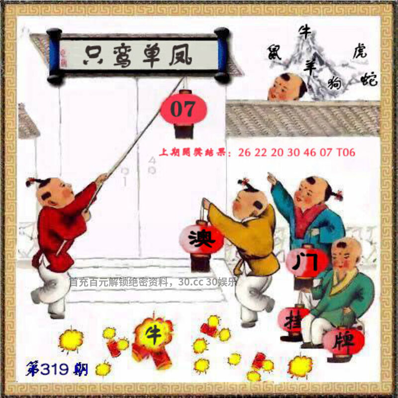 319期挂牌:《只鸾单凤》 解释:意为孤零零的一只凤凰。 解:单凤。解鸡蛇兔牛羊猪,挂:07爆:牛 七肖:鸡蛇兔牛羊猪鼠 |